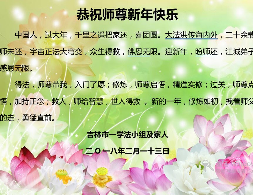 【明慧网二零一八年二月十六日】 上海闵行奉贤松江浦东大法弟子和大法小弟子恭祝师尊新年好!