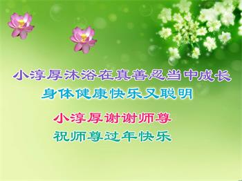 我是您的大法小弟子,今年六岁了,姥姥带我从小看师尊的讲法录像,会背《洪吟》。姥姥带我出去救人。我上幼儿园大班。我和姥姥一起学法,有时和姥姥到学法小组学法,现在我能通读《转法轮》了。我的天目开了,炼功时看到了闪闪发光的法轮。我也学会了向内找,修去了争斗心、贪玩心。 新年到了,我和姥姥一块给师尊写新年贺词,我哭了,我想念师尊、感恩师尊!叩谢师尊!我一定好好修炼,做一个合格的大法小弟子,和师尊回家。师尊新年好! 唐山一大法小弟子 吉林市大法弟子和大法小弟子恭祝伟大师尊新年快乐!