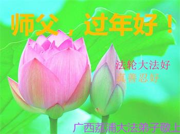 师父新年好!不管时间多长,压力多大,弟子都会正念正行,努力做好三件事,谢谢师父的慈悲救度! 北海大法弟子叩拜 广西壮族自治区北海市合浦县学法小组的全体大法弟子合十叩拜:向慈悲伟大的师尊拜年!恭祝师父新年快乐!谢师父救度之恩!