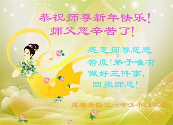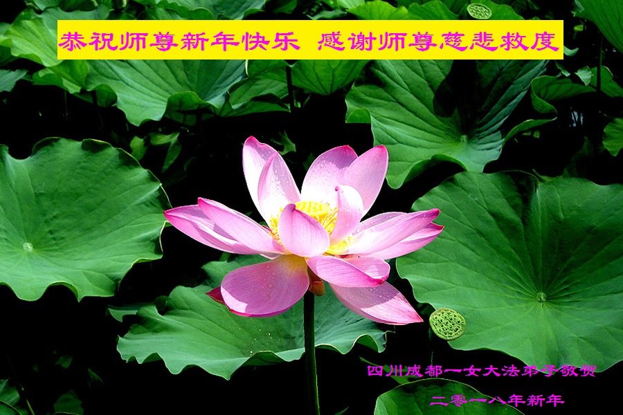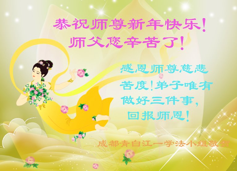 师尊您好!师恩浩荡,弟子叩拜慈悲伟大的师父,谢谢师尊慈悲救度。新的一年里弟子要努力走出消沉状态做好三件事,跟随师尊返回真正的家园。 四川省成都大法弟子恭祝慈悲伟大的师父新年好!