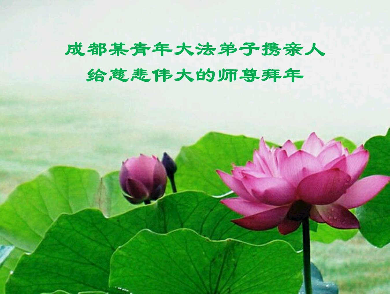 四川省成都市龙泉驿区一大法弟子携家人恭祝师尊新年快乐!
