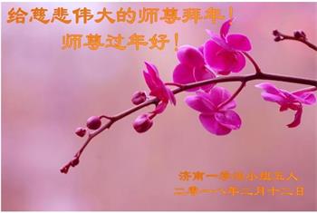 师尊好,师尊辛苦了!感谢师尊慈悲救度,感谢师尊为我们清理身体,净化心灵,提高心性。用尽人间语言也无法表达我们对师尊的感激和敬仰。一定听师尊的话,做好“三件事”,正念正行,实修自己,讲清真相多救人。跪拜师尊。 山东济南一学法小组全体大法弟子恭祝师尊过年好!