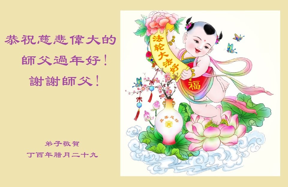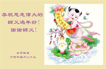 师父好,您又是一年的辛苦,弟子们感恩您把我们从地狱中带出,身体得到净化,并成为正法时期的弟子,是您付出了无数的心血。弟子们唯有精進实修,做好三件事。晋州市全体大法弟子叩谢师尊佛恩浩荡,祝师父永远快乐! 河北省石家庄一大法弟子全家八口人恭祝师尊过年好!