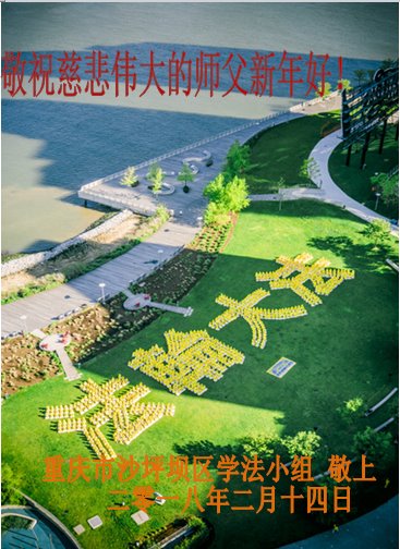 师父您辛苦了!弟子一定做好三件事,感恩师父的慈悲救度! 重庆沙坪坝区一学法小组大法弟子恭祝师父新年快乐!