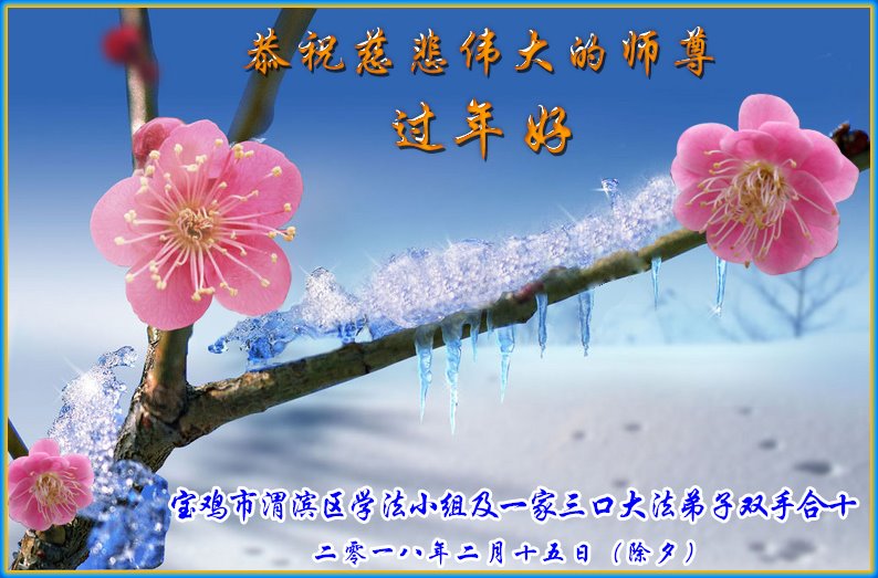 祝师父新年快乐!: 师父过年好! 全世界大法弟子过年好! 2017年里弟子没有做好三件事,愧对师尊的教诲,在新的一年里弟子想做好三件事,望师尊慈悲加持! 陕西榆林大法弟子敬上 大法弟子家人敬上 陕西宝鸡一学法小组大法弟子恭祝慈悲伟大的师尊新年快乐!