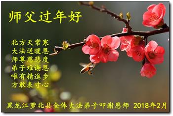 尊敬的师父:新年好! 我们全家同声恭祝慈悲伟大的师父新年快乐! 春天来了,我们和师父相见的日子不远了,愿南飞的大雁带去我们对师父的问候与思念,愿和煦的春风捎去我们盛满圣果的锦囊与心愿。祝师父早日回到祖国,回到神州故国。 法轮大法好,众弟子回归净土。您力挽狂澜,宇宙得以净化,众生终能得救。人心归正道德升,满满众生登法船。我们全家跪拜师恩,我们发自内心的呼喊:法轮大法好!真、善、忍好! 合十 黑龙江省黑河市大法弟子一家人敬上 黑龙江大法弟子给师父拜年!