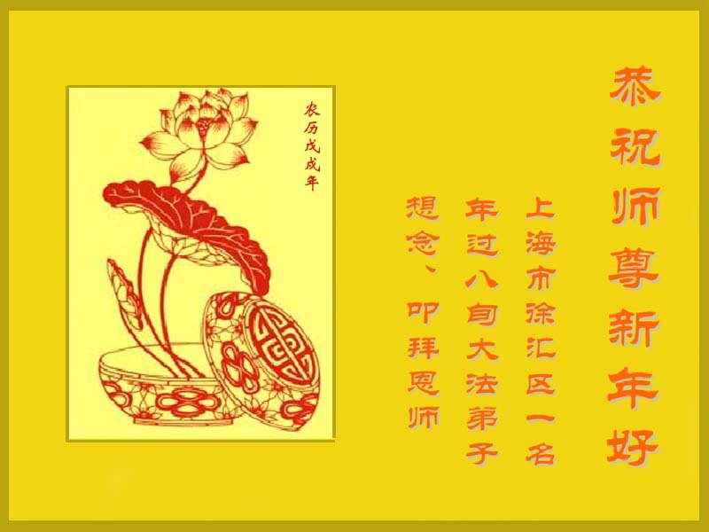 恭祝慈悲伟大的师尊新年快乐! 上海杨浦两个大法弟子敬上 上海讲真相小组恭祝师尊皇历新年快乐!