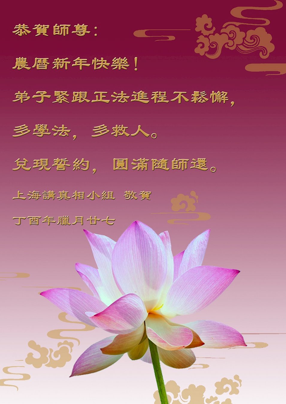 恭祝师尊皇历新年快乐!弟子紧跟正法進程不松懈,多学法,多救人。兑现誓约,圆满随师还。 上海讲真相小组 敬贺 丁酉年腊月廿七 一在上海的吉林市大法弟子恭祝师尊新年快乐!