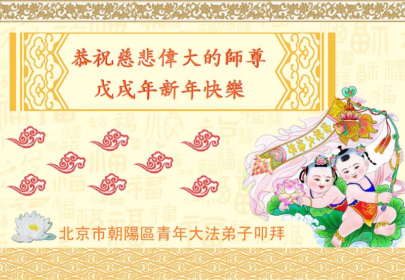 弟子想念师尊,盼望师尊早日回中国。我们听师尊的话,做好三件事,不辜负师尊的期望,走好最好的路。叩拜师尊! 北京全体大法弟子恭祝师尊戊戌新年快乐!