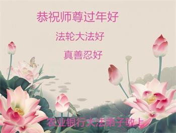 建设银行全体大法弟子恭祝伟大的师父新年快乐! 伟大的师尊新年好!建设银行全体大法弟子给您拜年了,恭祝伟大的师父新年快乐!弟子们一定静心学好法、同化法,珍惜恩师用巨大付出延长来的时间,勇猛精進多救人、快救人、抓紧救人,兑现誓约,跟着恩师回家! 建设银行全体大法弟子跪拜 黑龙江哈尔滨市宾县卫生系统一大法弟子恭祝慈悲伟大的师尊新年好!师尊新年快乐!