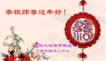 叩谢师尊让我们及我们的家属都沐浴在大法的洪恩中!弟子一定努力精進做好三件事,互相帮助共同走好正法修炼的路。 辽宁省沈阳五爱市场大法弟子恭祝师父过年好!