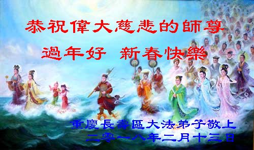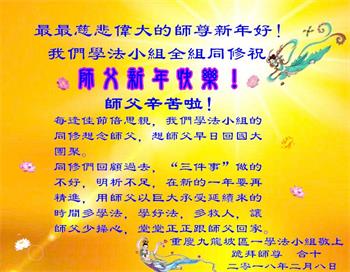 最最慈悲伟大的师尊新年好!我们学法小组全组同修祝师父新年快乐!师父辛苦啦! 每逢佳节倍思亲,我们学法小组的同修想念师父,想师父早日回国大团聚。同修们回顾过去,“三件事”做的不好,明析不足,在新的一年要再精進,用师父以巨大承受延续来的时间多学法,学好法,多救人,让师父少操心,堂堂正正跟师父回家。 重庆九龙坡区一学法小组敬上 合十 跪拜师尊 二零一八年二月八日 重庆市一大法弟子恭祝师尊新年好!恭祝师尊新年快乐!