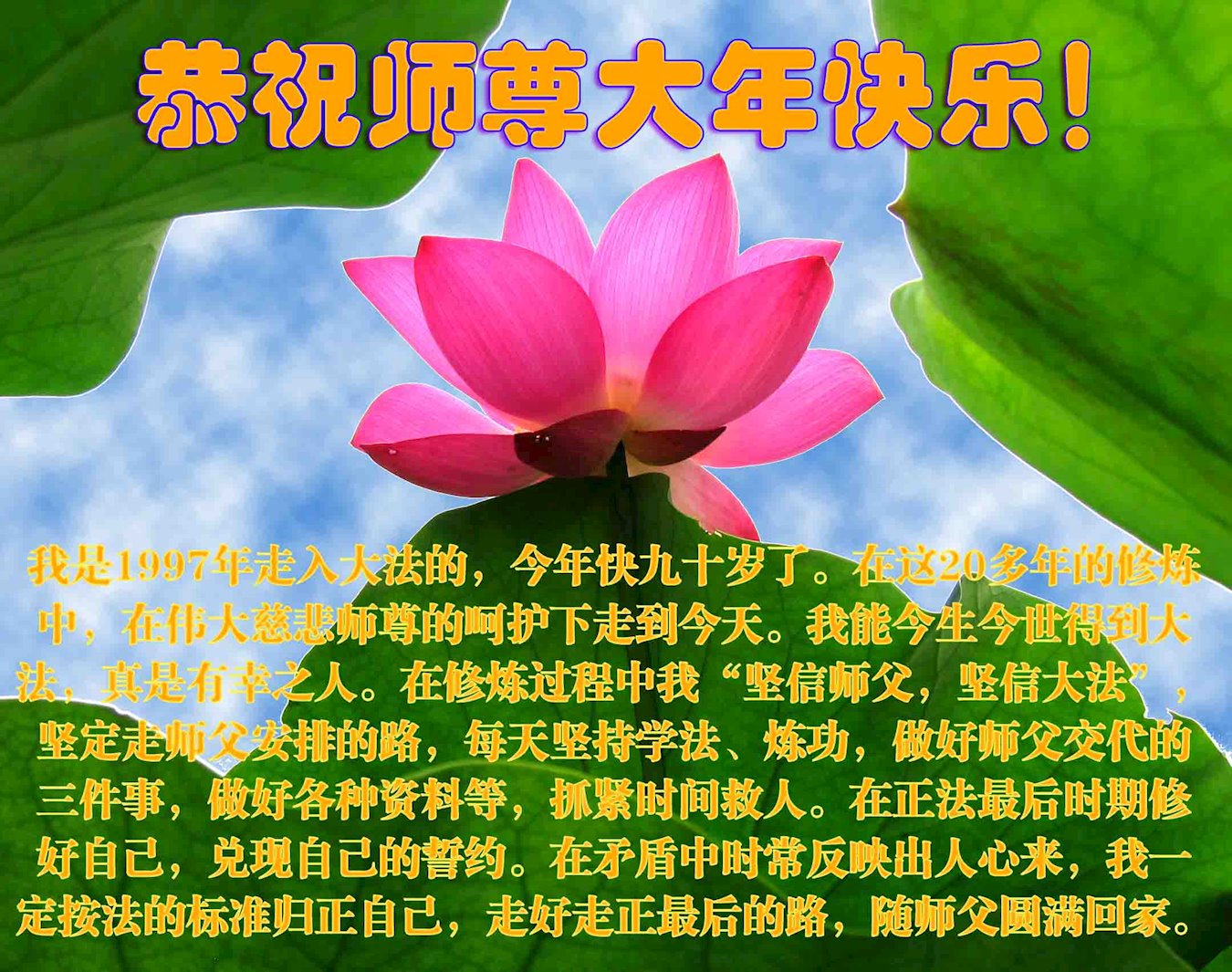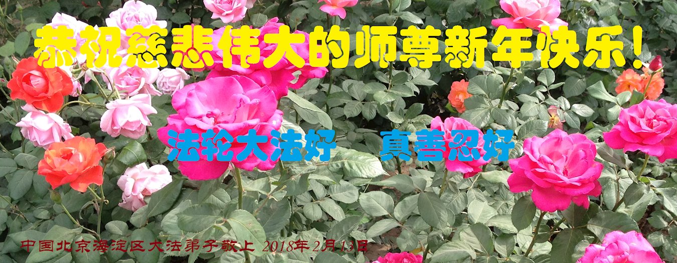 在这辞旧迎新的喜庆时刻,我们全体弟子怀着幸福、激动、感恩的心,向我们慈悲伟大师尊拜年!师父谢谢您!祝师尊过年好!不忘师尊苦度,我们精進过,也曾摔倒过,历经魔难,但我们都坚定的爬起来,走正修炼的路。牢记师尊洪愿,心系天下还在迷中的众生,修好自己,助师正法,不负大法弟子的使命和大法弟子的称号。敬请师尊放心! 北京丰台区丰台南路地区一大法弟子恭祝师尊新年快乐!