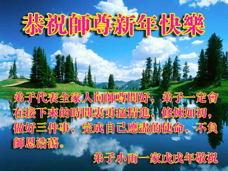 在十几年的修炼过程中,一路上磕磕绊绊,在新的一年里,我们要在新的一年里实实在在按法的标准做,做好三件事,讲好真相多救人,严格要求自己,请师父放心,盼望早见到师父! 四川、辽宁、北京的全家大法弟子恭祝慈悲伟大的师尊新年快乐!