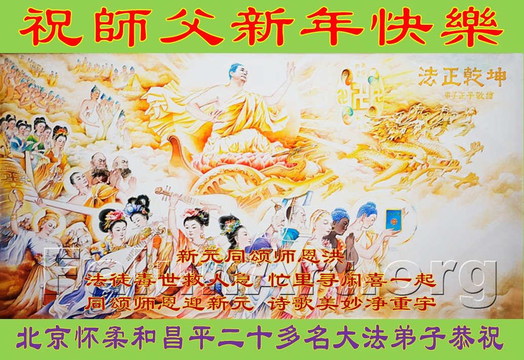 祝师父新年快乐!师父辛苦啦!谢谢师父! 盛会颂师恩 诗声歌声震云霄, 掌声如潮烂鬼消。 大法弟子慈悲展, 十方世界神欢笑。 喜颂正法师恩洪, 同唱法轮大法好! 北京昌平、海淀、西城和丰台等区二十多名大法弟子恭祝 北京海淀区大法弟子恭祝慈悲伟大的师尊新年快乐!