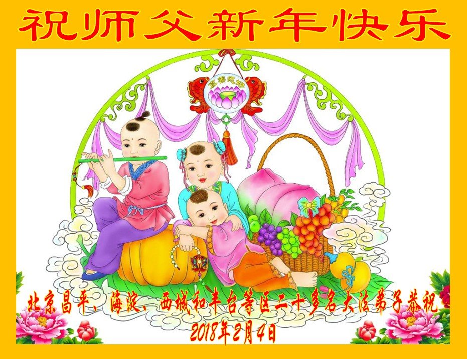 我们是北京朝阳区双井、百子湾、甜水园、团结湖、红庙和北京市丰台区南窑数十名大法弟子,在这辞旧迎新的喜庆时刻怀着幸福、激动、感恩的心,向我们慈悲伟大师尊拜年!师父,谢谢您!祝师尊过年好!不忘师尊苦度,我们精進过,也曾摔倒过,历经魔难,但我们都坚定的爬起来,走正修炼的路。牢记师尊洪愿,心系天下还在迷中的众生,修好自己,助师正法,不负大法弟子的使命和大法弟子的称号。敬请师尊放心! 北京六位大法弟子和家人叩拜恭祝慈悲伟大的师尊新年好!