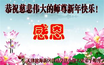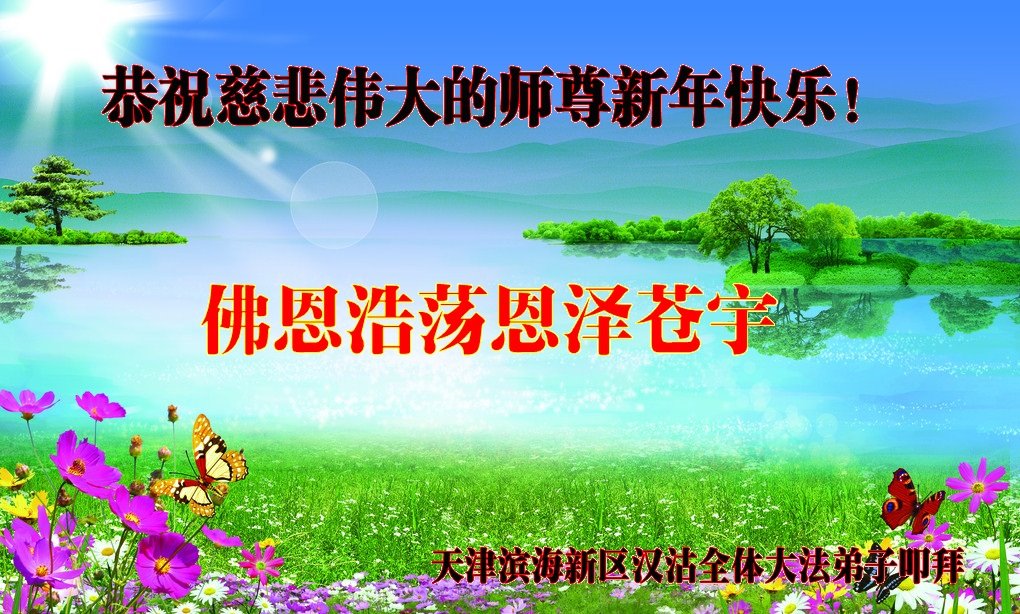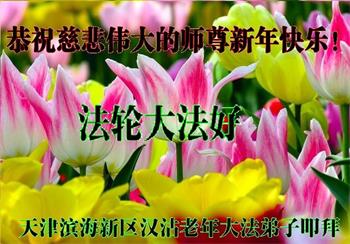 值此佳节,弟子们想念师尊!在此表达弟子们对师尊的感恩之心:谢谢师尊!谢谢师尊的慈悲救度!师尊,您辛苦了!弟子们要更加珍惜这万古不遇的修炼机缘,听师尊的话,多学法,学好法,修好自己,抓紧时间多救人,兑现我们的史前誓约!天津市塘沽区全体大法弟子叩拜师恩。 天津市一老年学法小组大法弟子及家人恭祝慈悲伟大的师尊过年好!