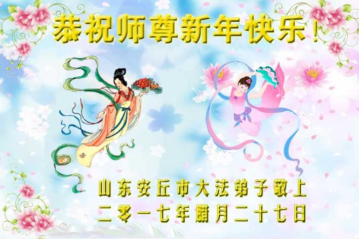 师父好!弟子想念您!新年佳节之际,我们期盼师父回国,与师父团聚。迫害十八年了,师父替弟子和众生承受了太多太多,弟子无法用语言表达对师父的感恩,诸城全体大法弟子一定尽心尽力,学好法,走好师父安排的路,做好我们的三件事,共同精進,以谢师恩!弟子合十敬上! 山东省潍坊市临朐县全体大法弟子给慈悲伟大的师父拜年!祝师父新年快乐!