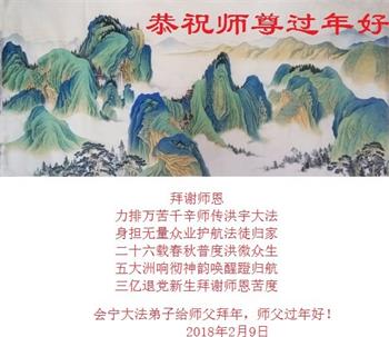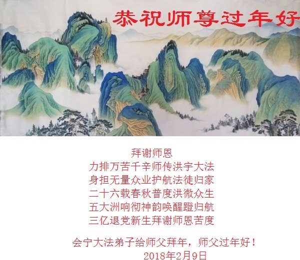 师父,您为我操碎了心,弟子却做了对不起师父的事,二十多年的修炼弟子愧对师尊的慈悲救度。在新年到来之际,弟子千言万语也无法表达对师尊的感恩与慈悲救度,跪拜师尊,遥祝师尊好,恭祝师尊新年快乐!弟子一定实修自己,做好三件事,兑现誓约,圆满随师还。 2018年2月6日 流离在外的大法弟子 大陆大法弟子给师尊拜年!