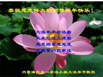 莲花 师父正大穹 我助师尊行 法轮常转动 法船载众生 慈悲是法理 善解随心意 返回真本性 莲花满天庭 千里祝愿师尊好 徒儿盼望师父安 双手合十给师父拜年 弟子 内蒙海拉尔一学法小组大法弟子恭祝师尊新年快乐!