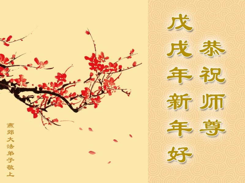 转眼又一年到了,在这里燕郊大法弟子恭祝师尊戊戌年新年好!感谢师尊传给我们法轮大法,让我们能够用真善忍的标准做好人,使人类道德回升,让更多的人能够沐浴在大法慈悲与美好的法光中。 大陆大法弟子祝师尊过年好!