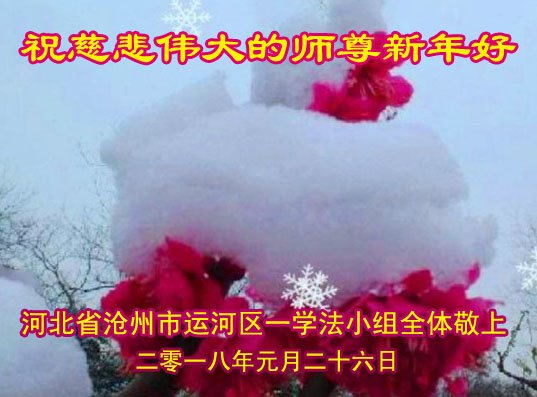 岁月匆匆,新的一年又来临了,弟子怀着无比感恩的心情恭祝师尊过年好!感谢师尊在过去的岁月里对弟子及家人的关爱呵护以及给弟子和家人清理身体!弟子以后会努力精進实修,向内找,去执着,跟师尊回家。 河北省沧州市运河区一学法小组全体大法弟子恭祝慈悲伟大的师尊新年好!