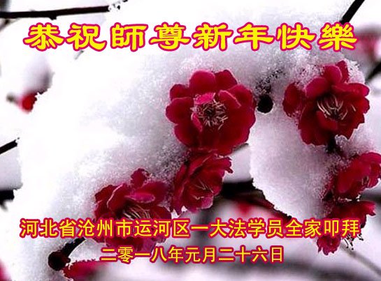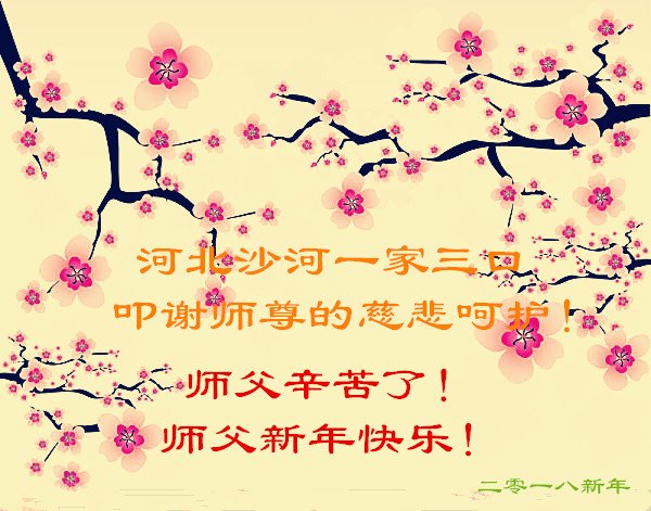 泊头市富镇全家大法弟子恭祝师父新年好! 师父辛苦了! 师父谢谢您! 经历了太多太多,才更感恩师父的洪大慈悲救度!才更明白正法的意义,才更明白自己的责任和使命,我们全家都在大法中受益,我们全家在新年到来之际,给师父拜年!师父谢谢你!师父辛苦了! 河北沙河大法弟子恭祝师尊新年好!