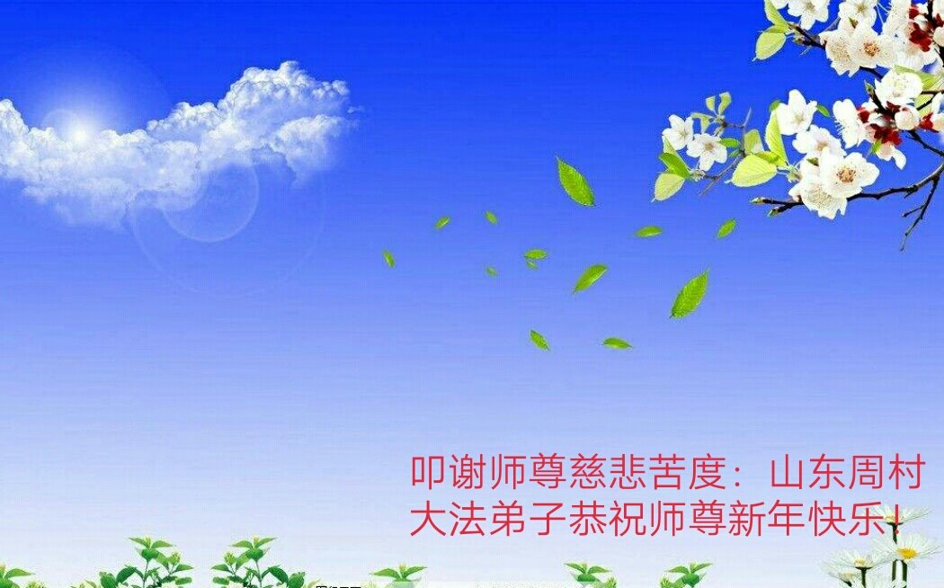 年年有今日,岁岁有今宵,今宵有不同。 回首修炼二十载,心中有太多的感慨,伟大的师尊给予弟子的太多!太多!为弟子承受的太大!太大!想想自己的付出太少!太少!根本的质变太小!太小!师尊一路慈悲导航,而我的小舟却前行的太慢!太慢! 今天的回首,使我惊醒,从即刻起我不要那么多的感慨,我要精進,要奋起直追,决不辜负伟大师尊的慈悲苦度,再不做那慢行小舟上的划桨人,在大穹去无多的有限时日里,用师尊赐给弟子的法宝,向内找,向内修,实修自己,多救人。完成使命,圆满随师还。坚定的助师正法,到法正人间的那最后一刻! 金鸡的鸣叫已远去 旺旺的狗儿报春晓 华夏儿女的大年到 亿众弟子惟愿师尊笑 至高无上的伟大师尊在上,我和丈夫两位老年大法弟子在遥远的祖国大陆东北给您拜年啦!师父过年好!恭祝师父新年快乐! 弟子跪拜师尊!叩首! 山东省淄博市张店区一老年大法弟子给师父拜年!恭祝师尊新年快乐!