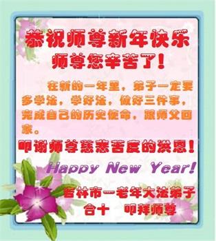 祝师父新年快乐! 师父,我以前做的很不好,在新的一年里我要精進,再精進,听师父的话,走正修炼的路,跟师父回家,不让师父再操心,谢谢师尊一直保护弟子及弟子的全家! 北京学院路地区一老年大法弟子给师尊拜年!恭祝师尊新年好!