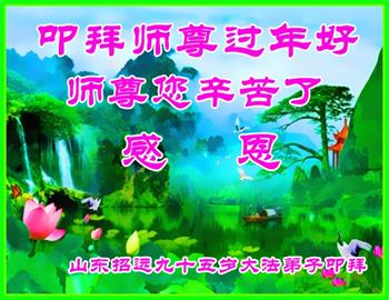 慈悲的师父好! 弟子在遥远的这边给您叩头了!恭祝师父过年好!新年快乐!弟子想念您。 修炼二十年来,我们平稳、健康的做着三件事。其中有太多的感触,无限的感恩。没有师父的护佑我们是很难走过来的,师父的浩荡洪恩无以回报。 在黑暗、谎言的疯狂中,弟子由一个胆小、懦弱的女子变的善良、坦荡和坚毅,和过去判若两人。回想起来自己都觉的不可思议。师父告诉我们,大法弟子没有敌人,对迫害我们的人我们没有仇恨。由于我们讲真相,使很多同事及领导明白了法轮大法的真相,从而得救,使得家人由不理解变为支持我们。 是伟大的师尊、伟大的佛法改变了我们,成就着我们,使我们脱胎换骨成为无私为他的新生命。 再一次感谢师尊! 北京海淀区老年夫妇大法弟子叩拜 辽宁阜新一老年大法弟子恭祝师父过年好!