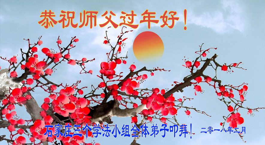 恭祝师尊过年好! 我是一九九四年八月五日得法的老弟子。师尊您辛苦了,在新的一年到来之际,感恩师尊救度之恩! 回忆 佛光普照处处春 济世普度传佳音 回想师尊讲法日 远隔重洋忆师恩 梅花笑迎新年到 中原弟子拜师尊 宁夏一老年大法弟子丁酉年腊月十五敬上 山东招远九十五岁大法弟子恭祝慈悲伟大的师父新年好!