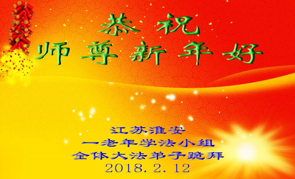 在新的一年里,我们学法小组全体弟子要更加精進,扎扎实实的做好三件事,多学法,向内找,多救人,兑现自己的史前大愿,圆满随师还。 淮安一老年学法小组全体大法弟子跪拜 2018.2.12 北京市朝阳区老年大法弟子敬祝师尊新年快乐!