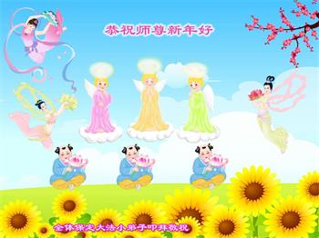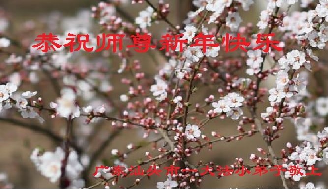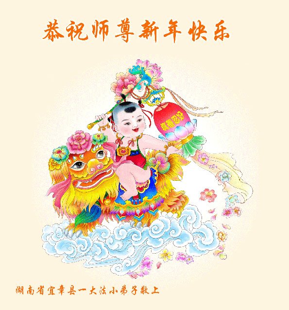 小弟子得法二十年了,已经成长为青年弟子,今后要精進,叩谢师恩。弟子一家多次承蒙恩师救度,无法感谢恩师,只能在传统新年来临之际虔诚敬祝:师父您好!师父您辛苦了!叩拜恩师! 广东省韶关市乐昌市大法弟子携大法小弟子恭祝师尊新年快乐!