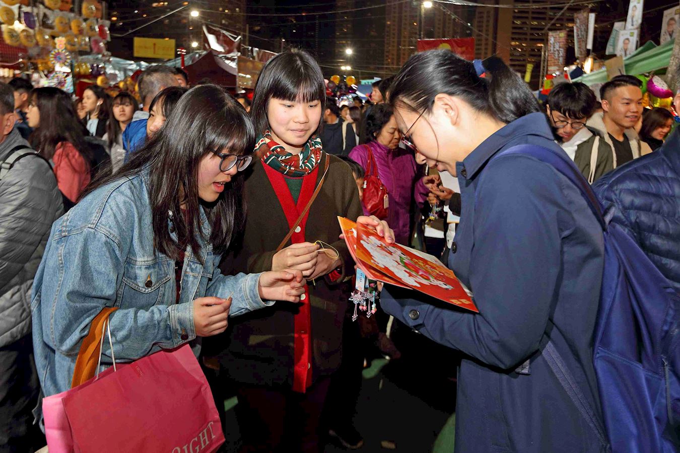 在年宵摊位讲真相的法轮功学员李女士表示,很多市民主动来询问拿取福字帖,接过后高兴地喊“法轮大法好”,还有很多中小学生都愿意接真相资料和了解法轮功。也有市民鼓励说:“你们做得很好!” 负责年宵真相点的香港学员胡太介绍,真相点气氛很好,喜欢来法轮功摊位看的人一年比一年多。市民除了喜欢真相小莲花,印有“法轮大法好”的福字帖也非常抢手,需要一再加印补充。此外,《天赐洪福》等真相小册子也很受欢迎,许多民众看到都开心接过,了解真相。也有大陆游客到摊位请购大法书籍。据学员统计,过年前的一个多星期里,在各区点包括年宵,仅真相福字帖就派出了近五万份。 流动点遍地开花 有缘人寻大法书 香港学员平日在各个地区和各自岗位上讲真相。周先生等学员开设流动真相点,一星期五天,巡回走动,覆盖全港大大小小上百个地点,派发《明慧周报》和真相特刊。他感受到过去一年,市民与游客对真相材料的接受程度大了很多,很多人善意地感谢、合十、鞠躬,也有人多拿一两份给家人和邻居。港人除了知道法轮大法好,也知道中共团伙对真相点的干扰,遇到有人试图动真相点的横幅物品,很多人会挺身制止。也经常遇到市民鼓励继续坚持,表示“最佩服你们”。 而且,年轻人包括学生,愿意拿《明慧周报》和真相报刊的比例都越来越多,最近出版的《共产主义的终极目的──中国篇》特刊也很受学生欢迎。也多了二十至三十岁的年轻大陆游客,看到《明慧周报》的封面都很愿意拿,收起来就带回去,“香港和大陆民众都人心觉醒,勇气大了,敢于拿真相。” 周先生赞叹《明慧周报》的大法真相有如种子,现在经常有常人拿着上面的广告到书店请购大法书,或向学员问修炼的事。 法轮功学员希望在新的一年,越来越多港人和游客能够觉醒接受真相,更多有缘人走入修炼。
