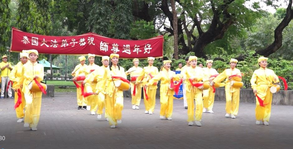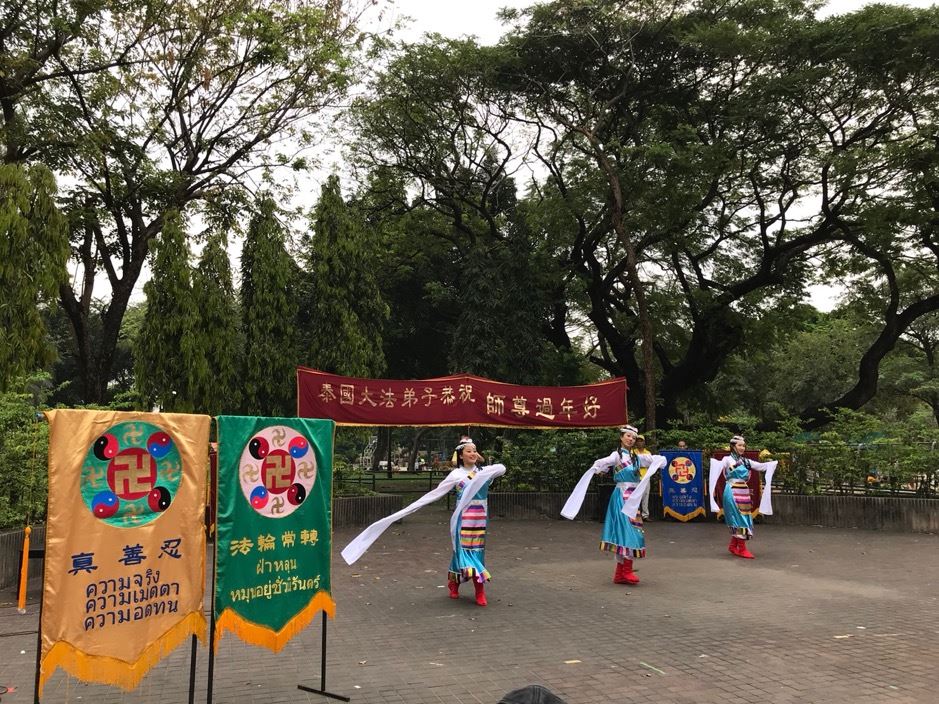 泰国曼谷仑皮尼公园(是乐园)法轮功炼功点是当年师父亲自为弟子指定的炼功点,经常有世界各地的大法弟子慕名而来。这里也是泰国法轮功学员多次举办集体活动和恭颂师恩的地方。每天都有很多各国游客和泰国本地居民来公园休闲和健身,泰国法轮功学员希望通过这样的活动,更多人能够领略法轮大法的美好。 活动除了集体炼功、给师父拜年以及集体合唱《法轮大法好》、《为你而来》和《颂师恩》外,还有活泼喜庆的腰鼓表演、祥和优美的功法演示、法轮功学员们的自编舞蹈、乐器演奏以及小合唱,小弟子们的表现也毫不逊色。在大家的齐心协力和互相配合下,节目个个精彩,不断吸引游客们驻足观看、拍照、接受真相资料、与法轮功学员攀谈,进一步了解法轮功。