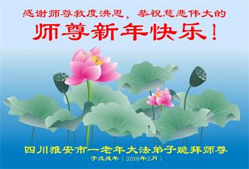 弟子给师尊拜年了:感谢师尊救度洪恩,恭祝慈悲伟大的师尊新年快乐!弟子目前尚处在魔难中,但是决心紧随师尊坚修大法到底,圆满随师回家。 四川雅安市一老年大法弟子跪拜师尊 四川德阳城区一老年大法弟子恭祝师尊新年快乐!