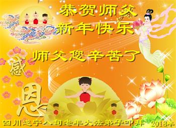 师父您好、师父您辛苦了!感恩师父的慈悲苦度!在过去的岁月里,慈悲伟大的师父为我们弟子付出与承受了很多很多。弟子的感恩之情千言万语无以言表,在2018年里,我们全体同修不负师父的厚望,珍惜来之不易的万古机缘,珍惜正法时间,精進实修,加倍的努力做好三件事。彻底否定旧势力的一切安排和干扰,修去各种执着心,归正自己的一思一念,整体提高,整体升华。努力完成大法弟子的神圣誓约,完成历史赋予助师正法的伟大使命,走正走好最后的路,圆满随师还。我们感恩师尊!感恩大法!再次恭祝师父新年快乐! 四川遂宁市二位老年大法弟子及家人恭祝师尊过年好!