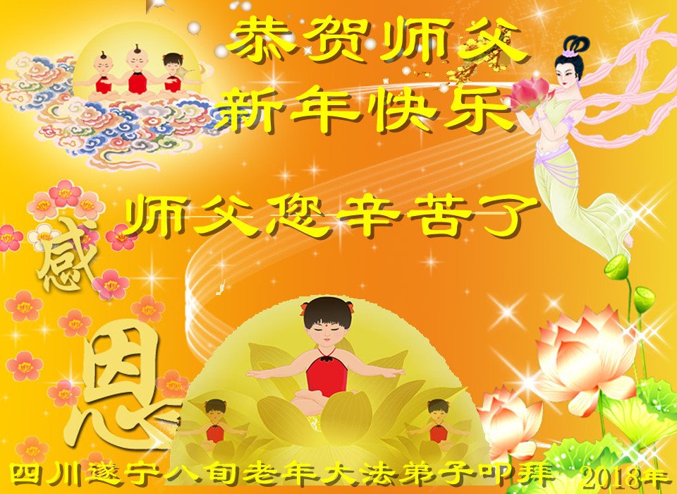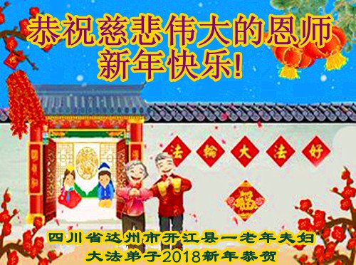 值此二零一八年中国新年到来之际,弟子满怀感恩的心情恭祝慈悲伟大的师尊过年好!新年快乐!弟子今年两次出现病业假相,都在师尊的慈悲保护下,用正念闯了过来,谢谢师尊对弟子的洪恩!新年伊始,弟子一定要更加珍惜师尊赐予弟子的宝贵机缘,勇猛精進,听师尊的话,修好自己,多救世人。请师尊放心,弟子决不会辜负师尊对我的希望。再次感谢师尊对弟子的慈悲救度!遂宁市弟子叩拜师尊! 四川省遂宁市北门一对老年夫妻大法弟子恭祝师尊新年好!
