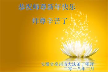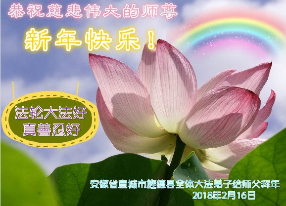 慈悲伟大的师尊您好!感谢师尊慈悲救度之恩,不管中共邪恶怎么迫害,我们全家仍然坚信师尊,坚定修炼法轮大法,向师尊指明的神路前進,谢谢师尊的保护,让我全家受益。 广德老年大法弟子全家向师尊拜年!合十叩拜! 2018.2.8 安徽池州大法弟子恭祝师父新年快乐!