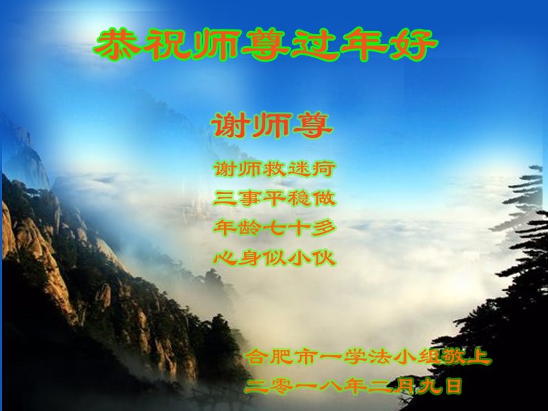 安徽铜陵大法弟子敬上 2018年2月15日 安徽省六安市金寨县老年女大法弟子代表几位大法弟子给师尊拜年!祝师尊新年快乐!