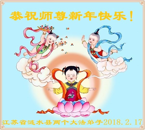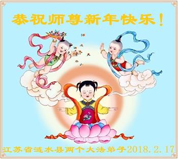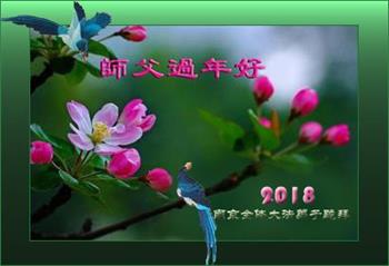 江苏省涟水县两个大法弟子恭祝师尊新年快乐!又一个新年到了,很高兴能给师尊拜年! 2018.2.17 江苏省南京一老年学法小组全体大法弟子祝师父新年快乐!