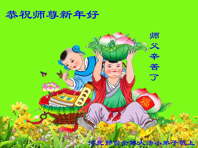 在这新年来临之际,弟子携幼子给伟大的师尊拜年。 每每回顾历史都不禁泪如雨下,感慨师尊从最初亿万年前在宇宙中的下走,到来到险恶人世为人类奠定历史与文化的轮回中,为了救度众生历尽苦难艰辛,为弟子与众生默默承受着巨大的业力,耗尽了自己的所有……在我们对自己失去信心的时候师尊却从未放弃过我们,给予我们的永远是鼓励、度化与加持。弟子千言万语也无法表达对师尊的感恩之情,在这新年来临之际,也代表众生问候师尊,祝师尊新年快乐!师父您辛苦了! 上海大法弟子与小弟子 河北石家庄平山县姊妹小弟子向师父拜年!