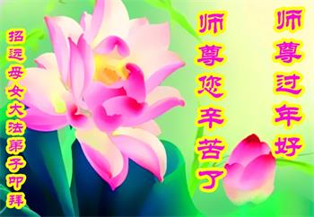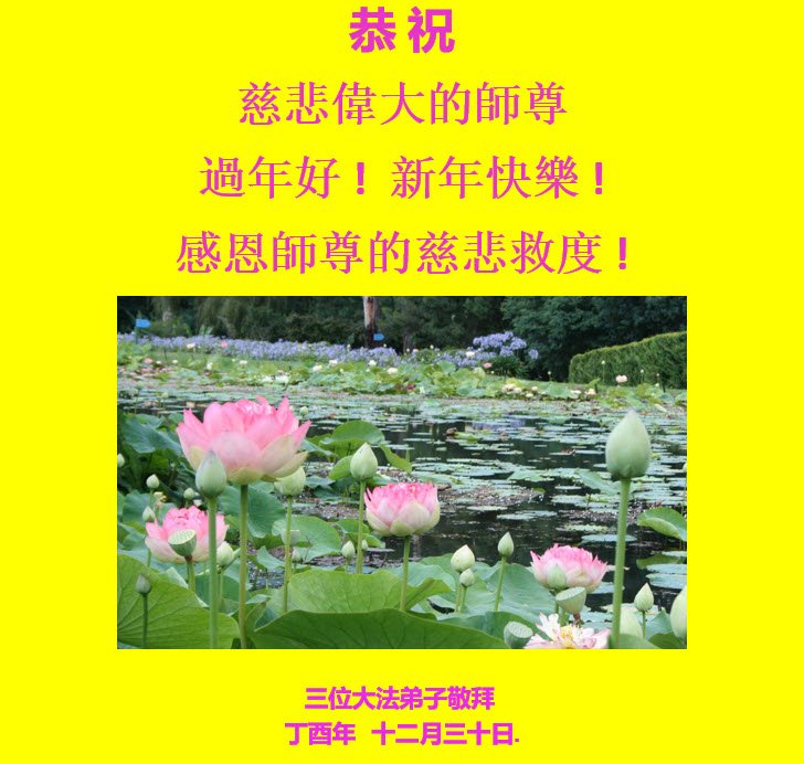 慈悲伟大的师尊好! 在新的一年里,我们一定遵循师尊的教诲,做好三件事,多学法,努力修心,圆满随师还。 盼望师尊早日回故乡。 三位大法弟子恭祝慈悲伟大的师尊过年好!