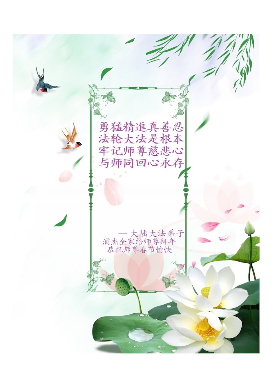 弟子每一次通过明慧网这个平台,向慈悲伟大的师尊带去问候与祝愿,真是弟子此生莫大的荣幸!弟子知道,人世间的一切都不是人生追寻的目标,只有修炼才是弟子今生真正的所为!从得法之初的喜悦,到经历了感情的爱恨情愁,从此大法在我的心中已深深的扎下了根!感谢所有帮我提高心性的人,在大法的指引下,我心里没有恨,隐隐的有一种被一层一层剥掉壳的清新的感觉,生命中充满着无限的美好与喜悦!我真真正正的找到了我一直苦苦等待和追寻的大法,在多学法和向内找的过程中,我感受到了自己生命的不一样,那就是让我内心踏实的归宿感!而今家里五岁的小弟子在我的带动下,已经自己读一遍《转法轮》了,我知道大法的珍贵与来之不易,只有精進不停,跟着师尊走神的路!师尊辛苦了!师尊为众生的承受,弟子在法中、在修炼中都能深深的体会到!请接受弟子充满无限敬意的叩拜:师尊过年好!