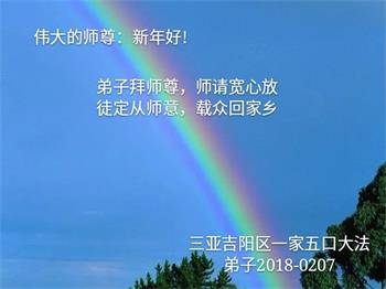 新的一年,我们一定好好修炼,让师父少操心,恭祝师父新年快乐! 四川省开江县随子女常驻海南的大法弟子恭祝恩师新年好!