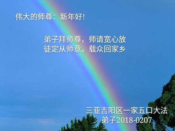 在2018年新年莅临之际,我们学法小组的全体同修怀着对师尊无限敬仰的心,向慈悲伟大的师尊问一声:师尊新年好!恭祝师尊新年快乐!在这特殊的历史时期师父以无量慈悲把我们从地狱捞起,晓以我们明白了宇宙的根本法理“真 善 忍”。引领我们走上返本归真的修炼道路。我们经历了风风雨雨和各种各样魔难的考验,走到今天。我们的修炼溶入了师父的多少心血,弟子无从知道也难以回报。唯有在今后修炼当中,不管时间还有多长,我们一如既往坚修到底!牢记师父“向内找”的法宝,修好自己,做好三件事,多救人。圆满随师还! 海南省三亚吉阳区大法弟子恭祝师尊新年快乐!