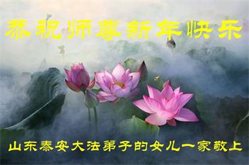 平原县一大法弟子代表全家向慈悲伟大的师父拜年!恭祝伟大的师父新年好!新年快乐!弟子不辜负师父的慈悲苦度,学好法,修好自己,做好三件事,多救人,跟师父回家。感恩慈悲伟大师父的苦心救度!谢谢师父!叩拜师父!跪拜师父!合十 山东泰安大法弟子的女儿一家恭祝师尊新年快乐!