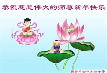 谢谢师尊的慈悲与呵护!才使我们度过了家庭魔难,在这里跪拜师尊!一定走好以后的路! 陕西省西安北郊一学法小组大法弟子恭祝师父新年快乐!