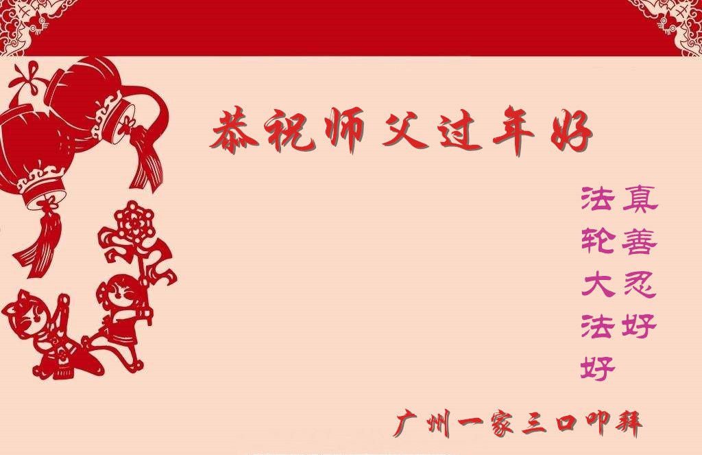 转眼又是新的一年即将到来,感谢慈悲伟大的师父为我们无私的付出了那么多,师父您辛苦了。祝师父您新年快乐! 广东省广州一资料点大法弟子恭祝师尊过年好!