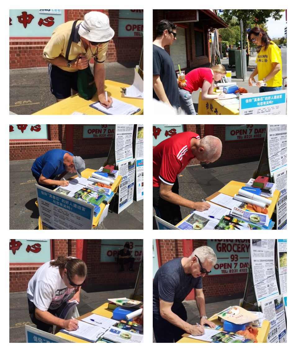 | 【明慧网二零一八年二月十九日】(明慧记者夏纯清阿德莱德报道)二零一八年二月十七日大年初二,一年一度的中国新年节庆集市在阿德莱德唐人街举行。南澳法轮功学员在唐人街入口处设立了真相摊位,向华人市民和游客拜年,也向过往民众传播法轮功的美好,送上新年福音,其中,来自明慧网的“吉祥娃娃年历”成为特别抢手的礼物。 人们通过和法轮功学员交谈以及各种资料,了解到法轮功真相,感受到学员们展示五套功法时祥和的能量场,他们对中共和江泽民残酷迫害法轮功感到震惊,希望澳洲政府能行动起来帮助制止迫害。  图1:各族裔民众在呼吁制止迫害法轮功的征签表上签名。 |